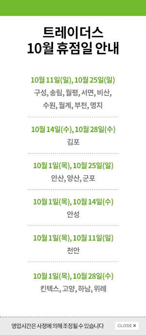 트레이더스 10월 휴일은 10월 11일(일),10월 25일(일):구성, 송림, 월평, 서면, 비산, 수원, 월계, 부천, 명지